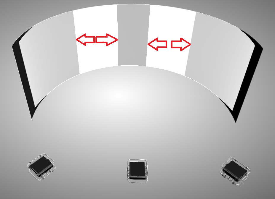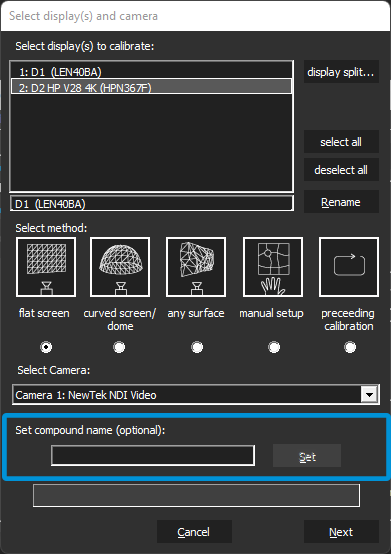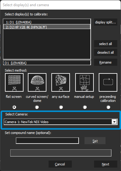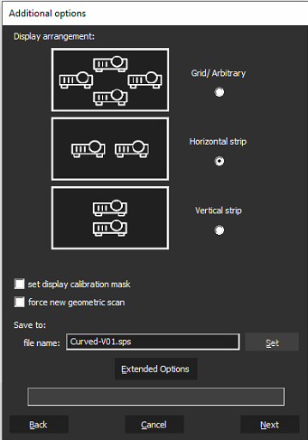 Flat screen (fast scanning) Camera-based method for flat and slightly curved screens (Examples: projection screens, solid flat walls, ceiling, or floors). Extrapolation works linear. It's very robust and can deal to some extend with faceted and unsteady surfaces. It lacks extended extrapolation settings and cannot use masks for blending optimizaton in favour to a simplified usage.