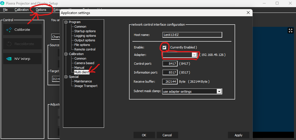 * On the Director and all Clients the VIOSO Calibrator should launch. On each instance or VIOSO Calibrator, go to `Menu - Options - Multi Client` and check the box `Enable`, then select the network interface (local IP) to connect with the other clients:<br>