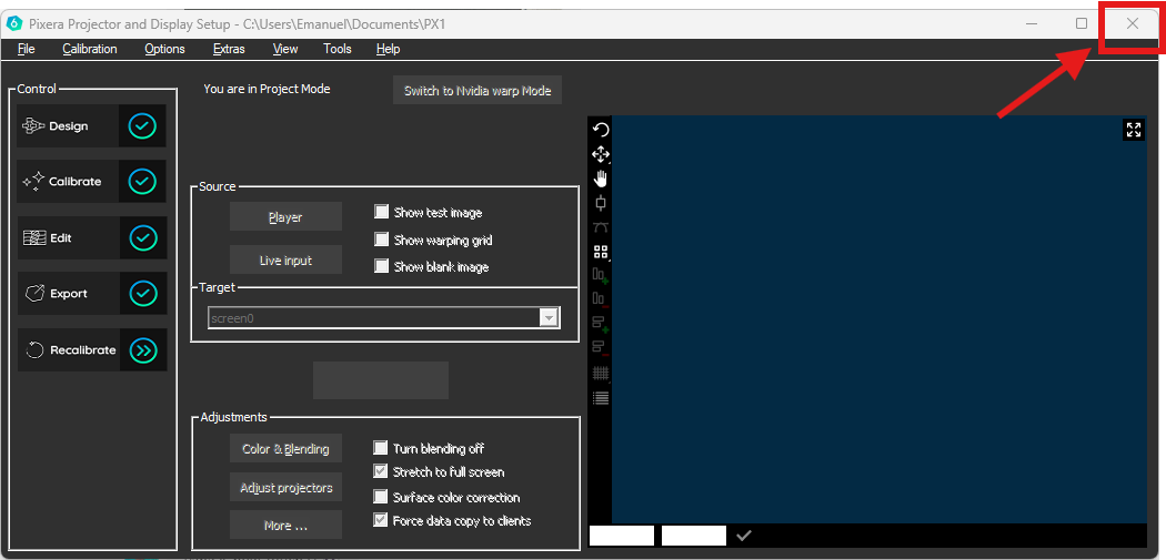 After exporting, VIOSO Calibrator has done the job and you can return to Pixera. Close VIOSO Calibrator by clicking on the top left Close button: