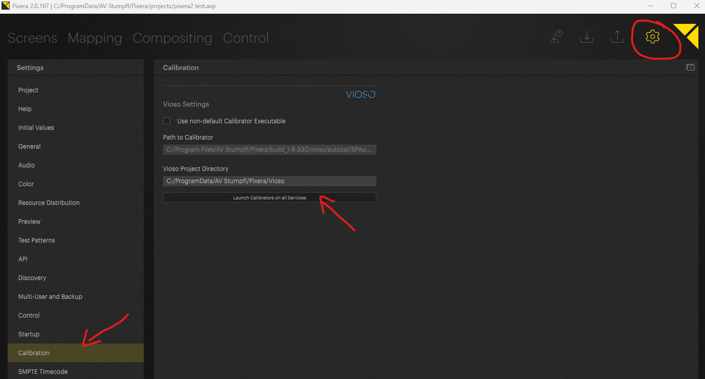 * In Pixera, go to `Settings / Calibration` and click `Launch Calibrator on all Services`