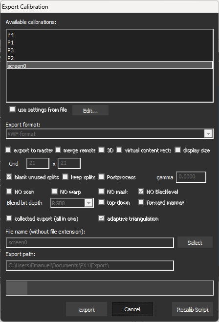 * File name definition: Specifies the name of the exported VWF files in the format `Filename_$ip$`. You can change `Filename`, but do not remove the trailing `_$ip$` as this adds the IP for each participating client, which is expected by Pixera.