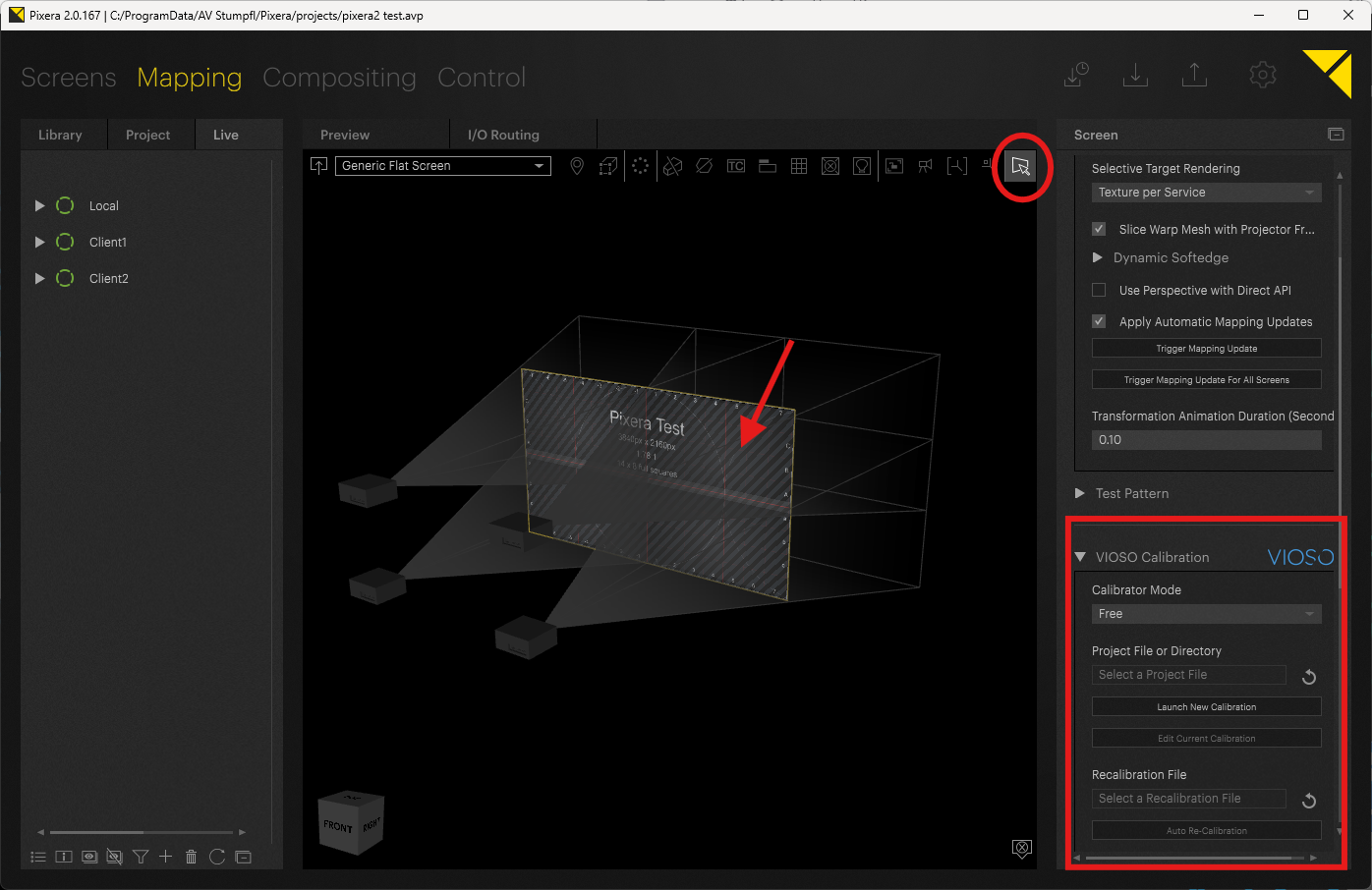 The basic topology is first created in Pixera. Screens and projectors are set up first, then the clients are connected and assigned. When calibration begins, Pixera passes all this information to VIOSO, which maps this topology in the Project Designer.&#x20;