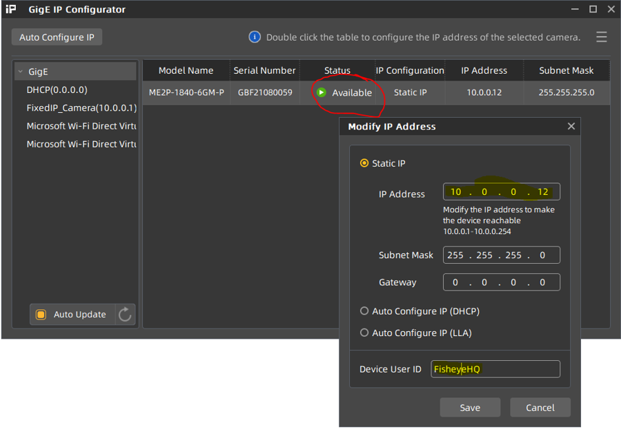 Optional: Right-Click on the camera name and open the “Modify IP Address” dialog. Enter an IP of your choice that fits to the IP range entered for this ethernet connection (e.g. 10.0.0.12 according to the example above). You also can change the device name of the camera.