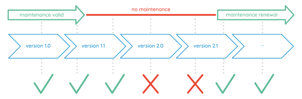 The end of such update subscription is called the maintenance expiry date of a license. When this maintenance expiry date is reached, a license will not work for newer software versions. The license is still valid without limitations for older software versions.
