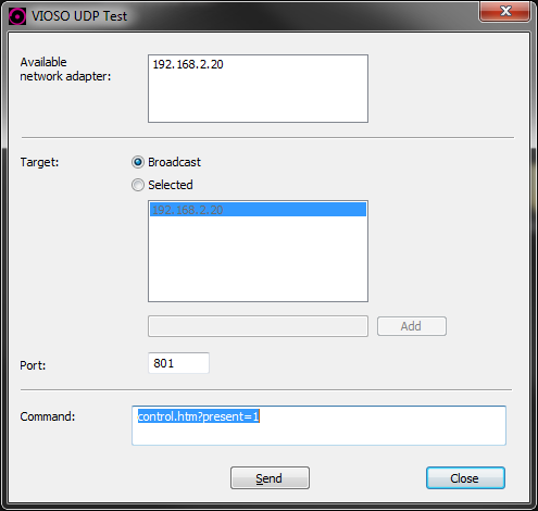 By pressing the “Send” button, the tool sends a datagram, containing the command string, to all selected targets successively. If you use the broadcast option, the tool sends a broadcast datagram.