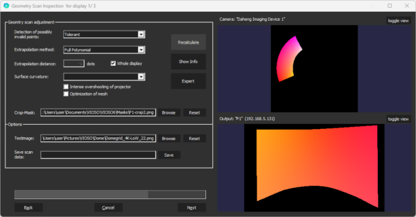 As a result, the whole screen should be covered with the testing pattern, getting a fairly good geometric alignment (not 100% accuracy is required at this step unless you go for seamless 360° panoramas):