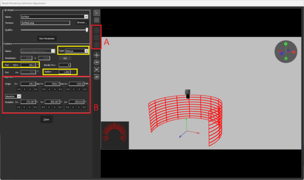 Edit the camera position either by moving and translating with the interactive tools (A) or by entering/editing the values directly (B). Make sure that the camera parameters are set (C).